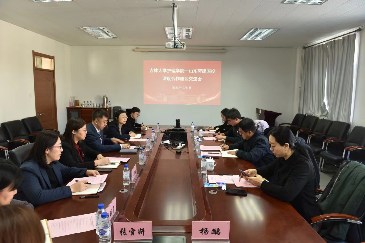 2023年12月1日上午,山东菏建国有资本投资有限公司(以下简称:山东菏建)董事长仝金安一行到公司就校企深度合作、护理及康复专业人才培养模式创新、员工实习就业等进行调研交流。公司党委书记韩月波,副经理李峰,党委副书记兼副经理、纪委书记葛宗梅,副经理李昆,以及康复治疗学教研室主任赵丽晶教授、康复治疗学教研室教师郭丽荣教授参加会议。会议由李峰主持。