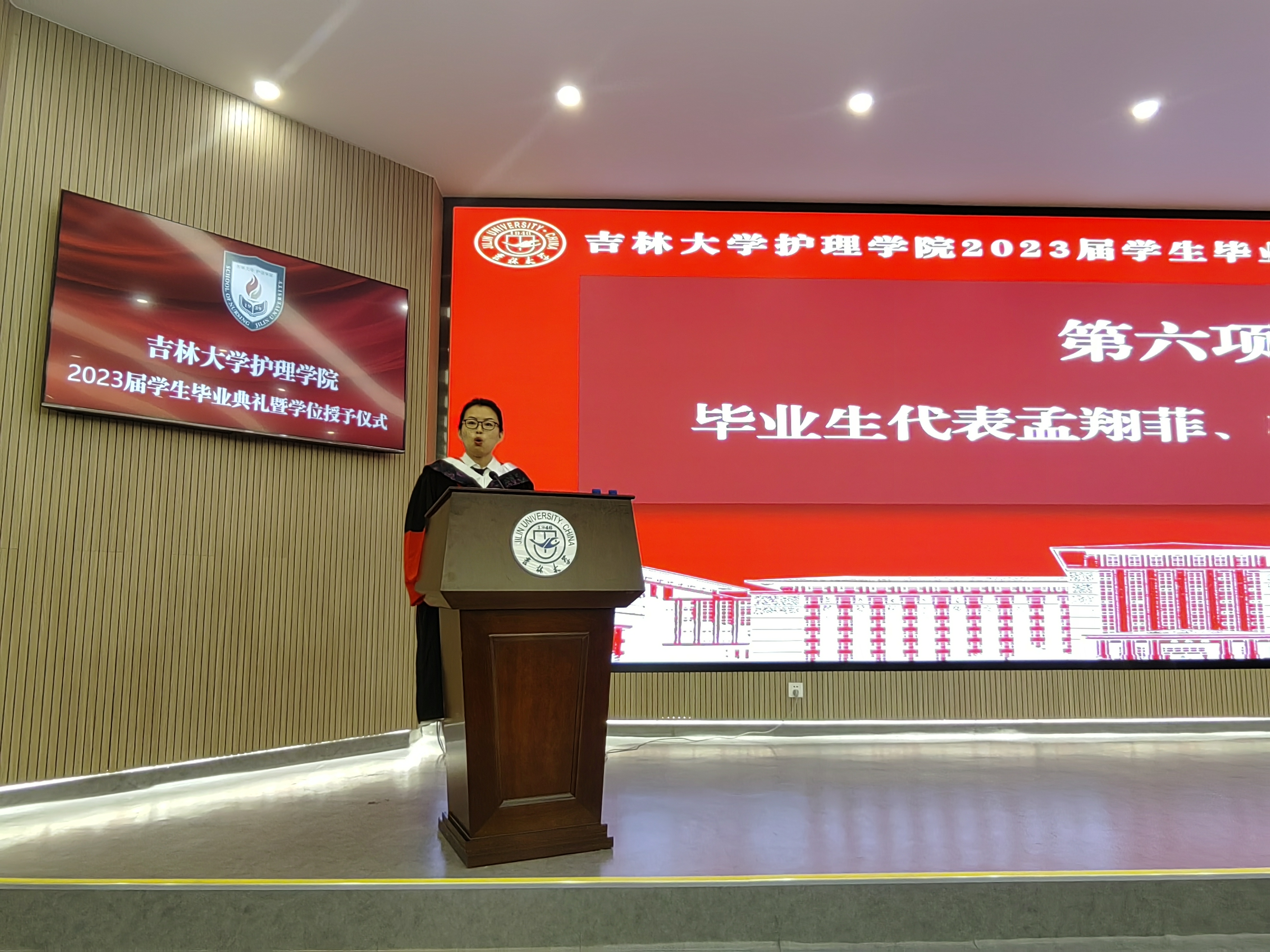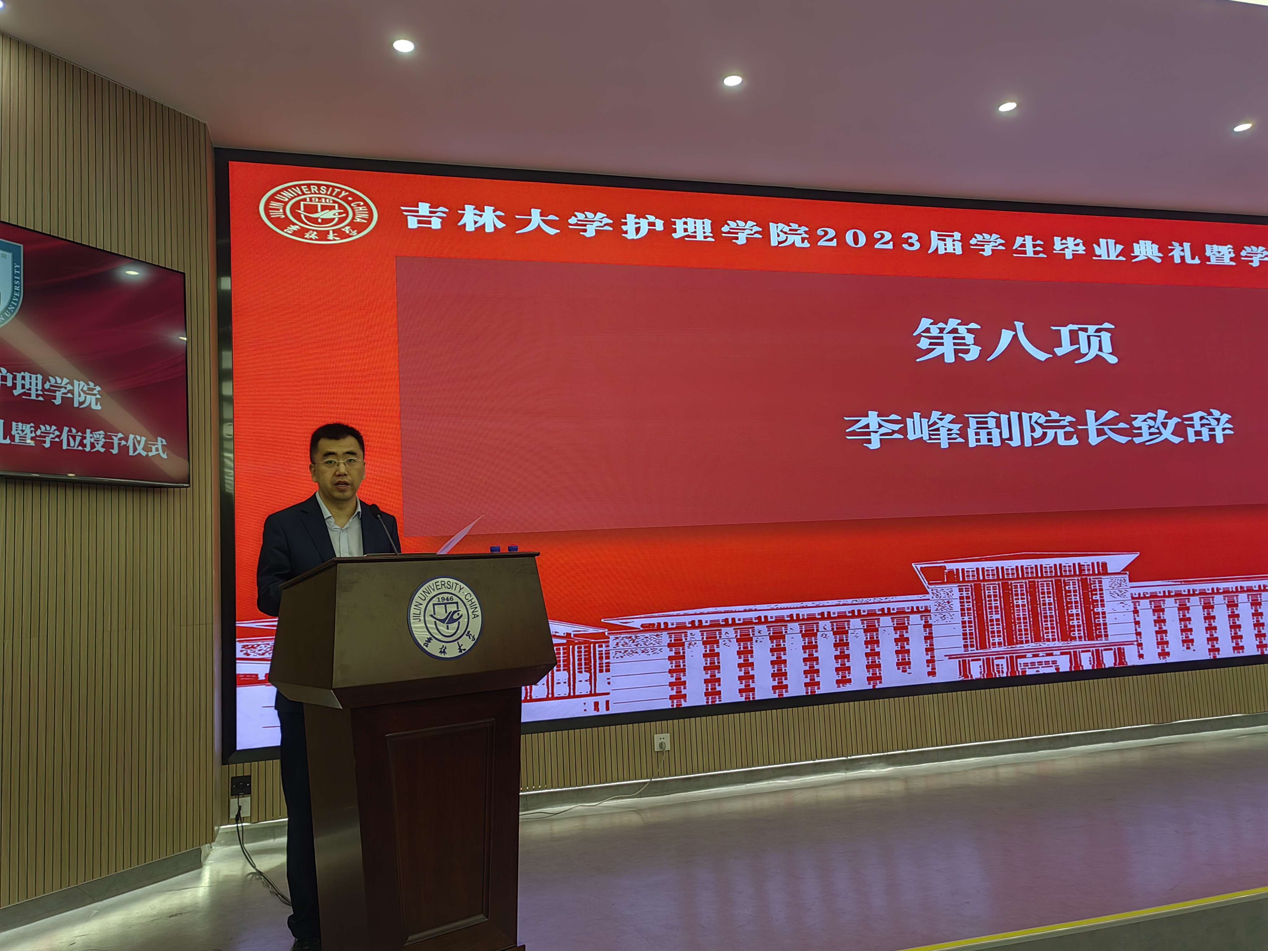 最后,副经理李峰教授致辞。他代表公司向圆满完成学业的毕业生们表示祝贺;向辛勤栽培他们的老师们和抚育他们成长的父母家人们致以崇高的敬意和诚挚的感谢;向在抗击疫情中所有冲锋在前、历经磨砺与成长的志愿者们表示肯定和赞扬。对毕业生提出几点期望。第一,希望同学们终身学习,厚积薄发,永远保持好奇心和求知欲,在不断探索中收获更多的知识和智慧。第二,希望同学们不忘初心,从容致远,牢记白求恩精神和“慎独敦行,仁爱奉献”的院训准则,成为有大爱大德大情怀的护理人和康复人。第三,希望同学们抱负远大,勇攀高峰,树立远大志向,勇敢追求目标,主动把个人发展融入国家复兴大业,争当伟大理想的追梦人。