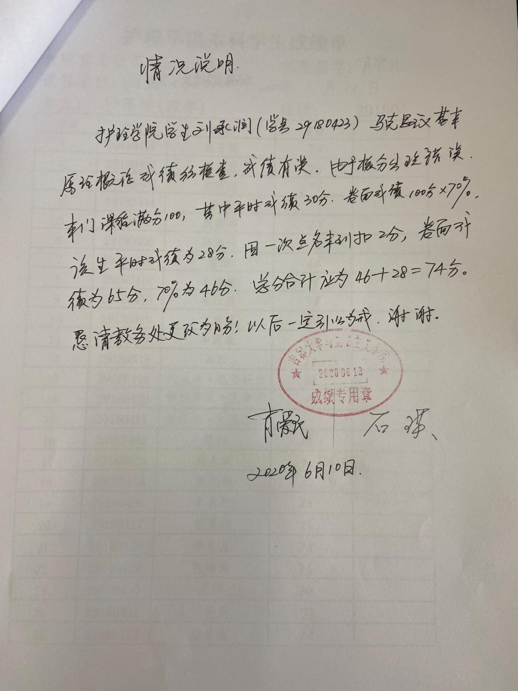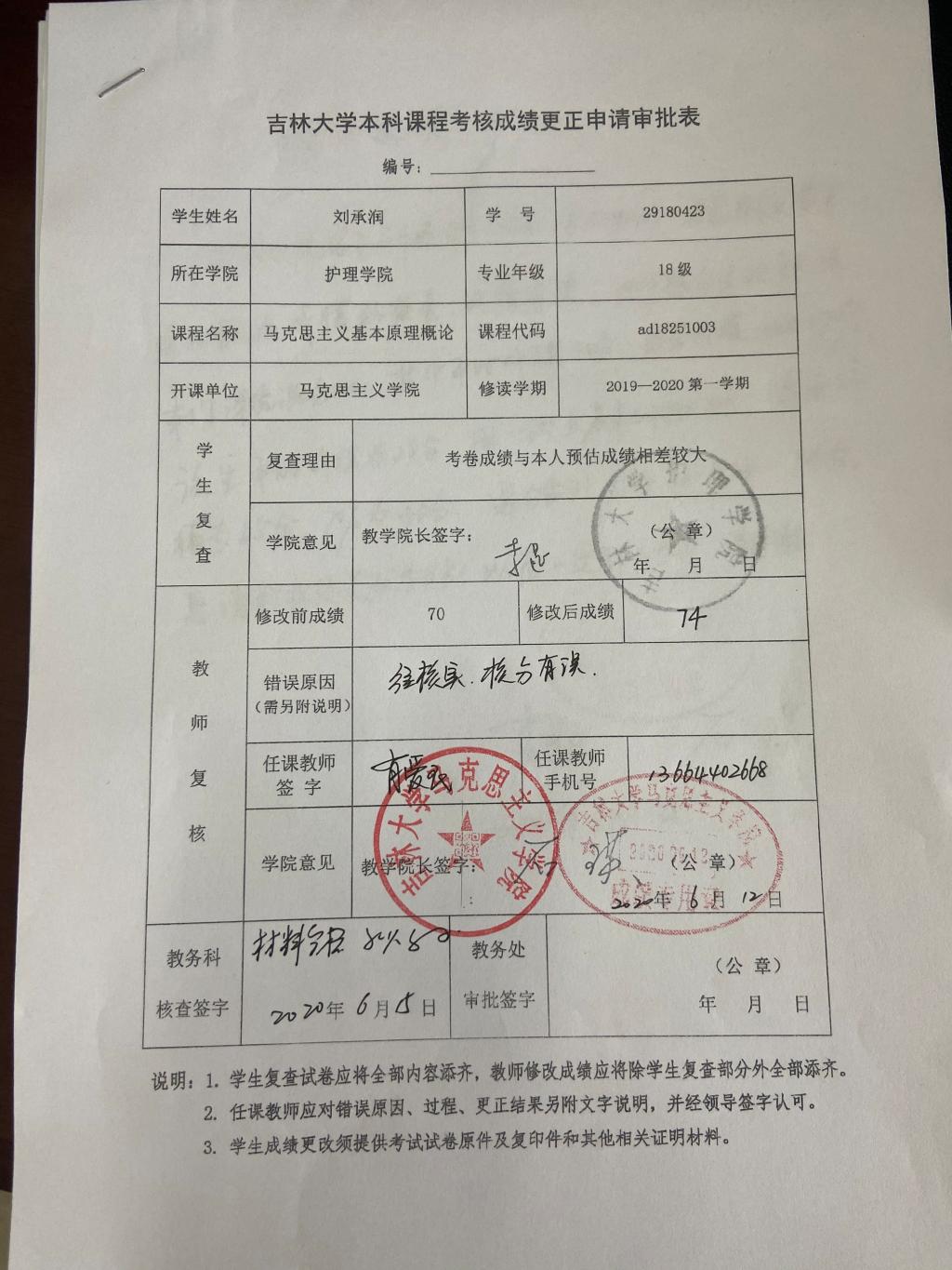 根据《关于进一步明确本科生课程考核等有关问题的通知》(校教字〔2018〕47号)文件有关精神,现对9428cn太阳集团古天乐2018级刘承润同学(学号:29180423)2019-2020-1学期课程成绩更正如下: