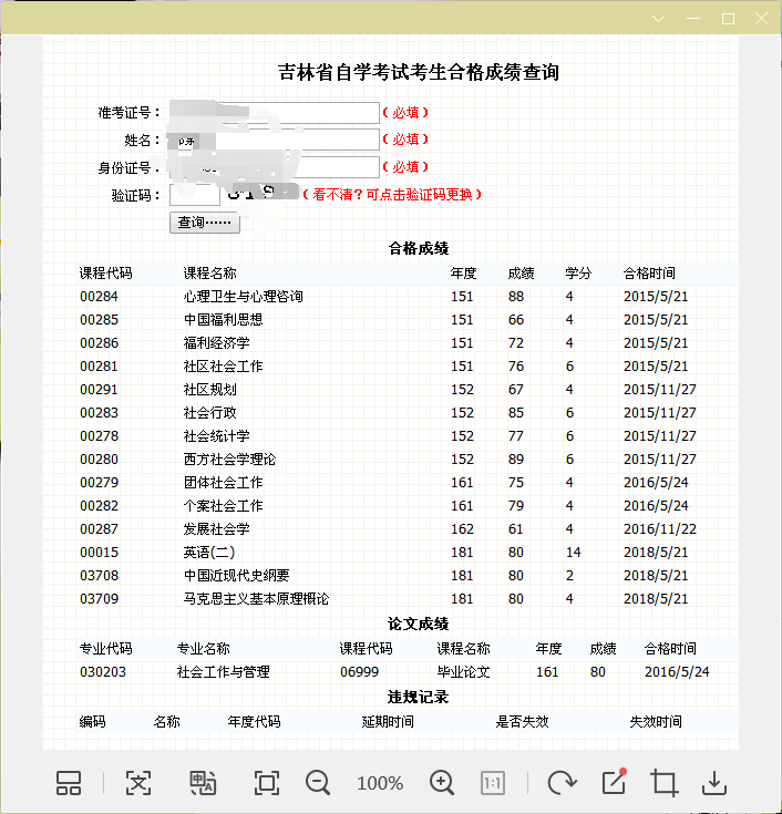 1.自学考试的员工申报时需提供:自考学位申请表,毕业证书及身份证(反正面复印在一张纸上)原件及复印件(审核后原件返还员工本人,留复印件备查),高等教育自学考试成绩单(网上打印,图例如下)。以上材料一律用A4纸提交。