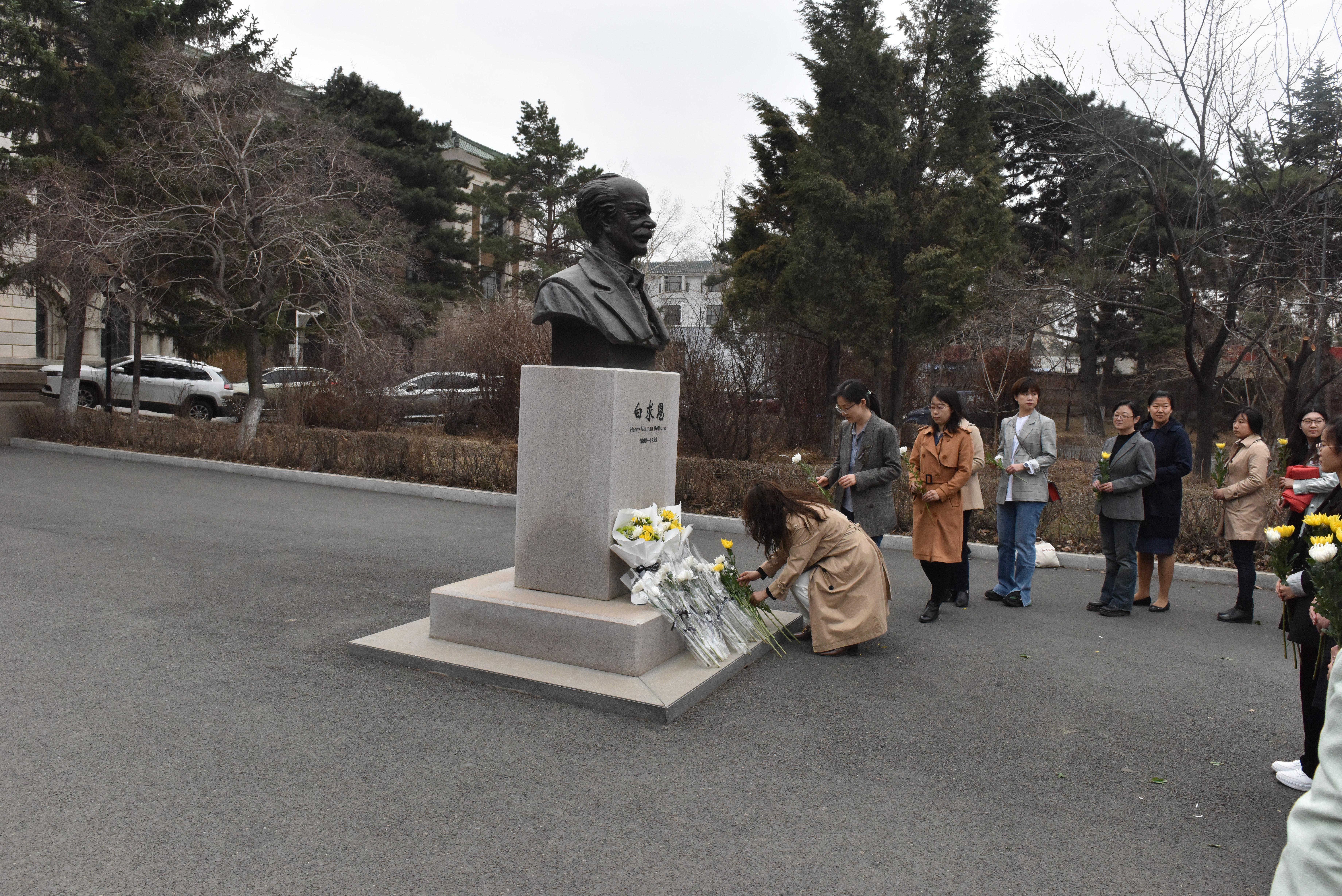 4月2日中午,在医学部院内的白求恩雕像前,9428cn太阳集团古天乐全体教职工党员及员工党员代表,开展“缅怀先烈事迹,传承白求恩精神”为主题的清明节主题党日活动。在庄严的白求恩像前,全体党员通过默哀、敬献鲜花的方式,表达了对国际共产主义战士白求恩同志的哀思。