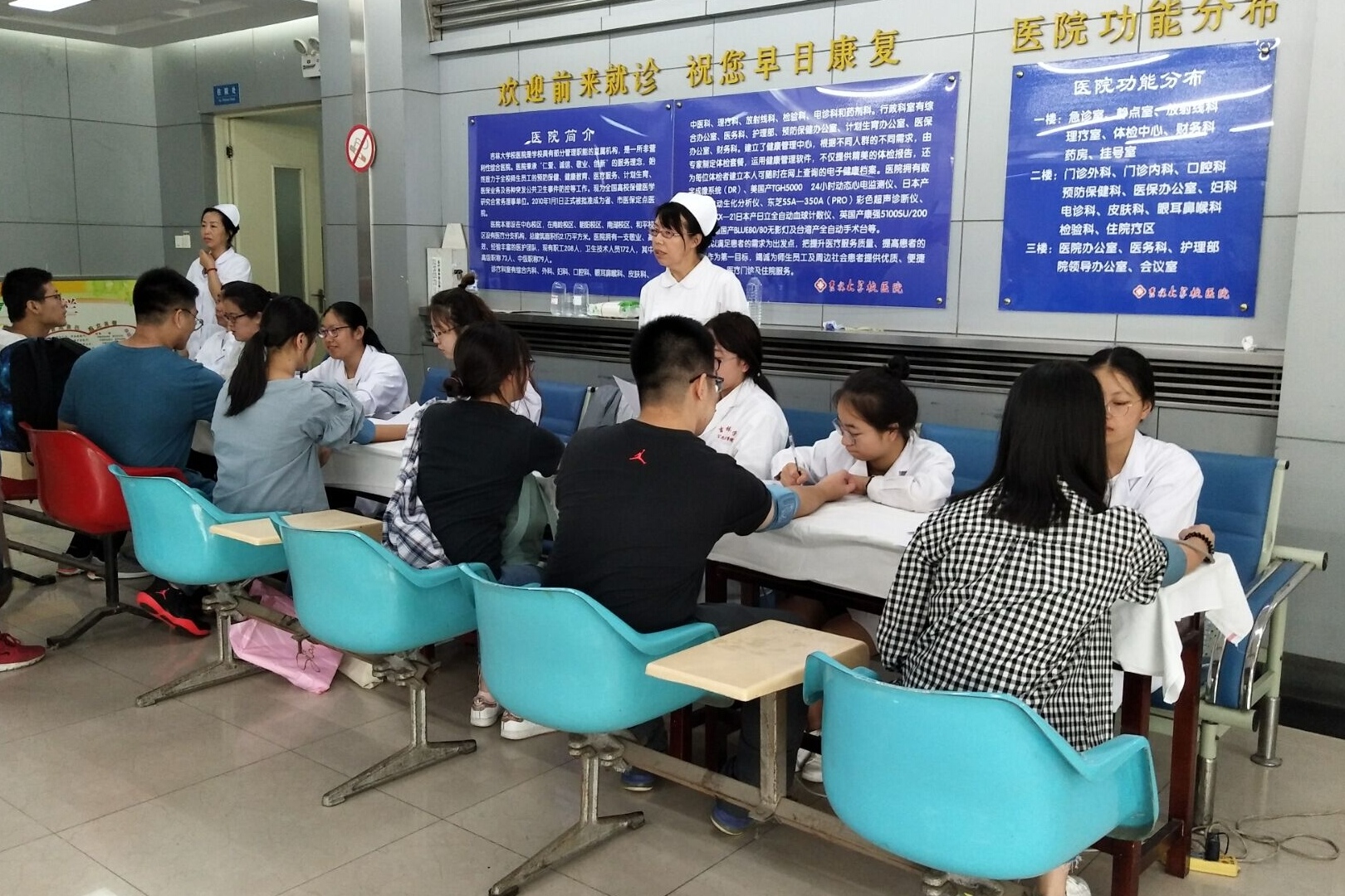 公司志愿者们陆续引导着新生来到五月花广场的报到处,在此办理业务的志愿者们耐心地指导着新生完成所有报到流程。之后志愿者们指引新生体检,并带领他们入住寝室。值得一提的是,公司有40名同学作为新生体检志愿者协助校医院完成引导、血压测量等体检工作,校医院对志愿者们的细心工作给予肯定。