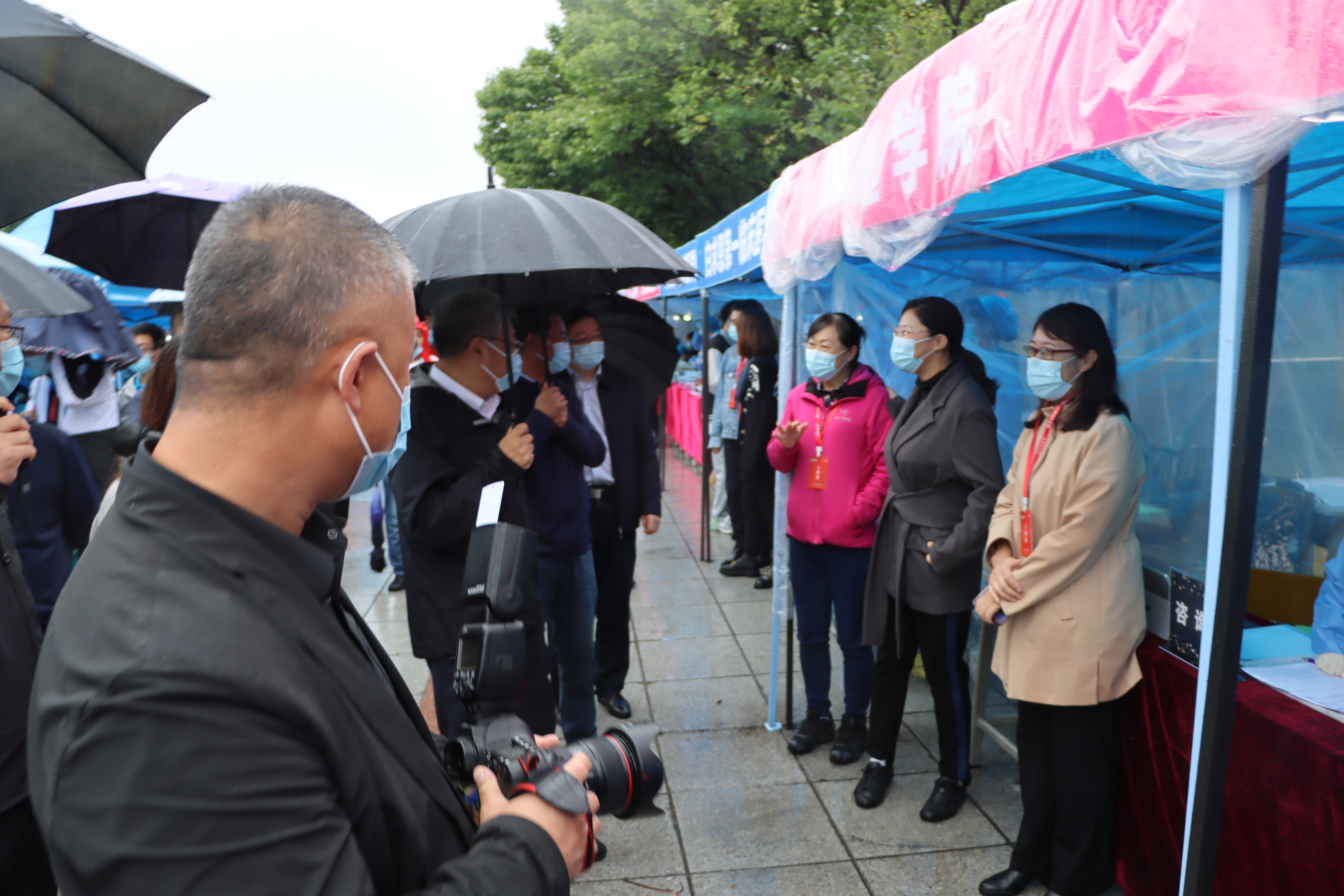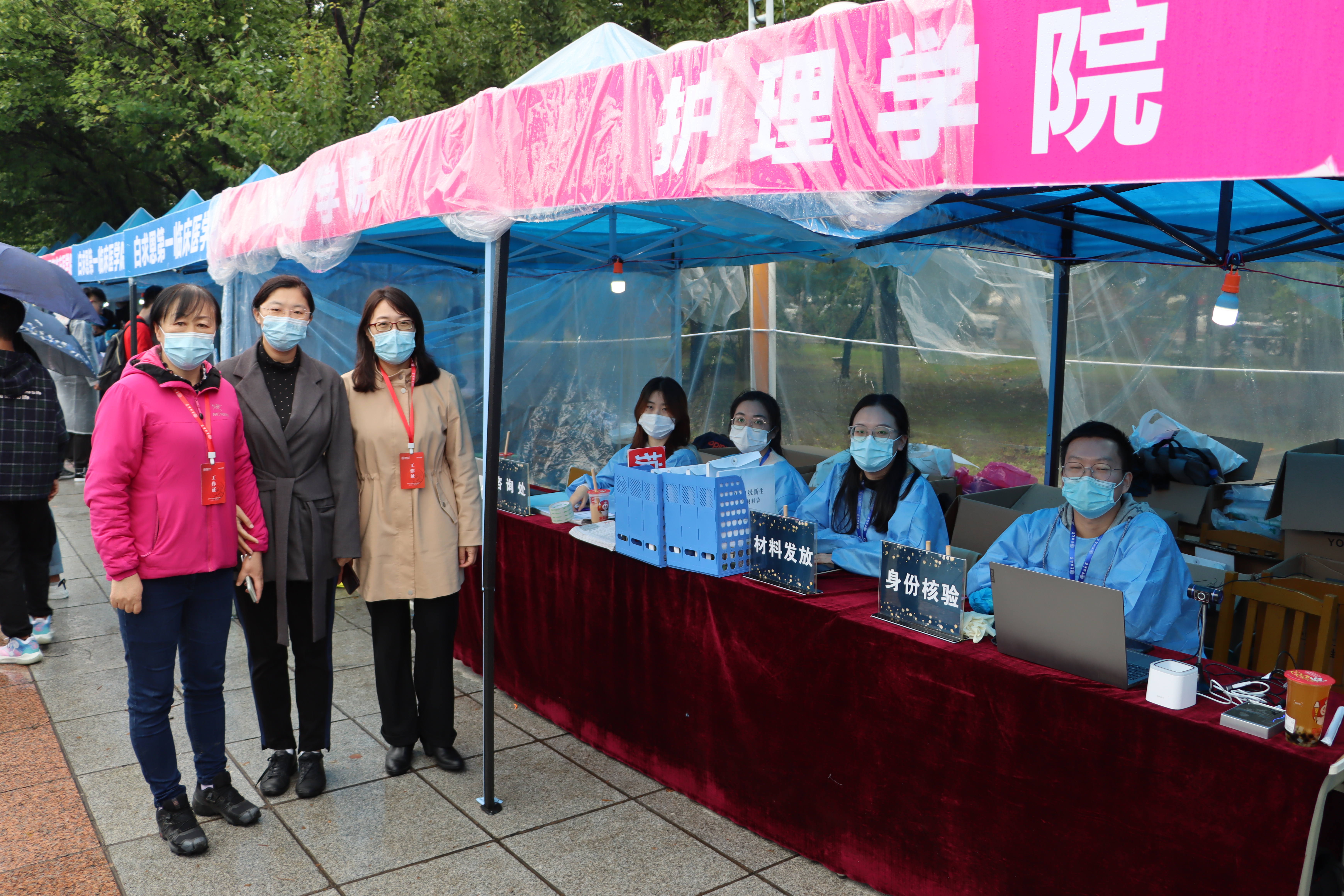22日早5:30,公司党委副书记兼副经理、2021级新生辅导员葛宗梅,辅导员李亚琴带领迎新工作者和志愿者到达南区五月花广场,布置迎新现场,虽秋雨绵绵,但期盼与新生相见的激动之心丝毫未减。